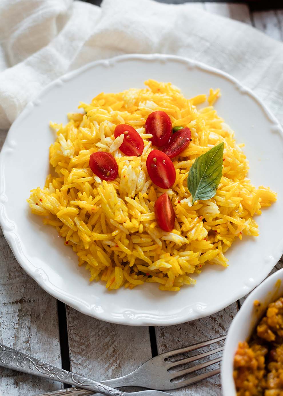 Für 2 Portionen Reis 150 g Basmati-Reis gründlich waschen und mit 300 ml Wasser in einen Topf geben. 1 TL Kurkuma hinzufügen und umrühren. Den Reis aufkochen, dann zugedeckt bei niedriger Hitze 10–12 Minuten köcheln lassen. Zum Schluss 1 EL Butter und eine Prise Salz unterheben. Der aromatische, leuchtend gelbe Reis passt perfekt zu Gemüse, Fleisch oder Fisch und sorgt für einen echten Hingucker auf dem Teller.