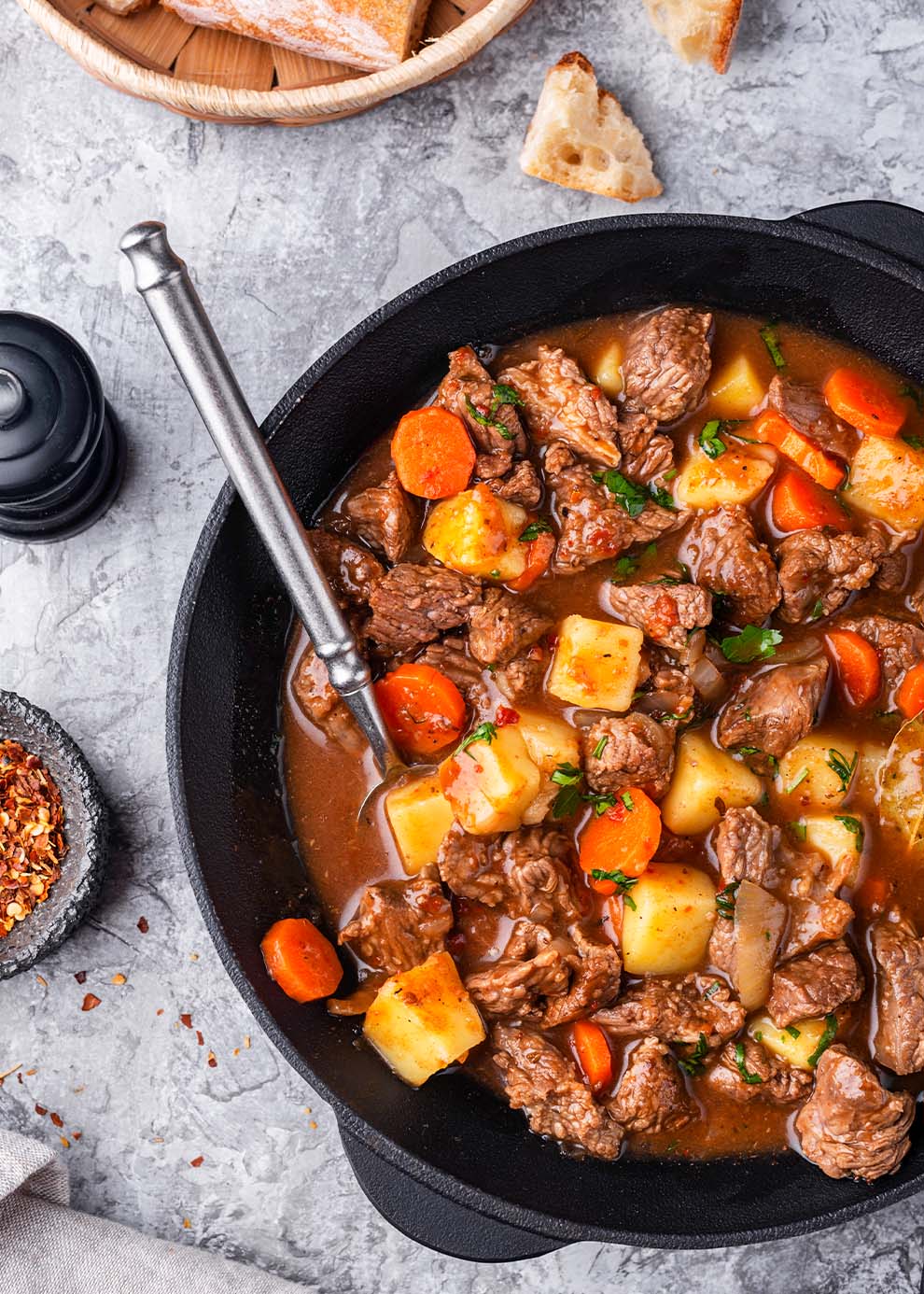 Für ein klassisches Gulasch 2 Zwiebeln fein hacken und in etwas Öl goldbraun anbraten. 500 g Rindfleisch (z. B. aus der Schulter oder Keule) zugeben und rundum kräftig anbraten. Mit Salz, Pfeffer und 1–2 TL Paprika rosenscharf würzen. Nach Belieben etwas Tomatenmark einrühren, kurz mitrösten und mit etwa 500 ml Brühe oder Wasser ablöschen. Zugedeckt ca. 1½ Stunden bei niedriger Hitze sanft schmoren, bis das Fleisch schön zart ist.