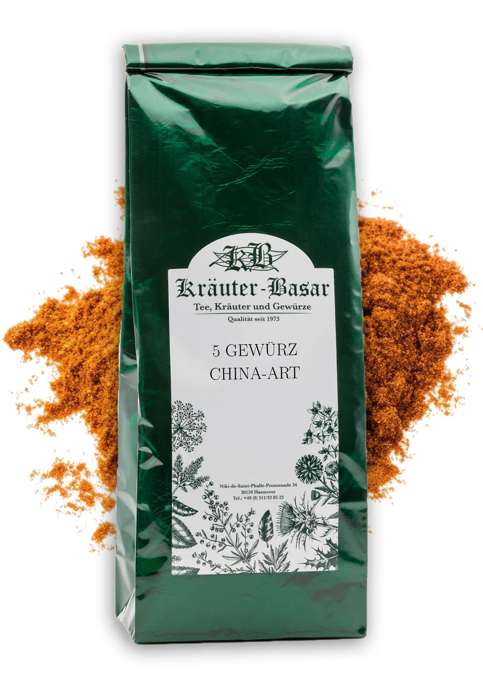 Die Mischung „5 Gewürze China Art“ vereint die Grundgeschmäcker süß, sauer, bitter, scharf und salzig in perfekter Balance. Mit Nelken, Sternanis, Szechuanpfeffer, Cassia und Fenchel bringt sie das charakteristische Aroma der chinesischen Küche direkt in deine Gerichte. Ob für Marinaden, Wokgerichte oder Schmorgerichte – diese Kombination sorgt für Tiefe, Wärme und ein unverwechselbares Geschmacksprofil.