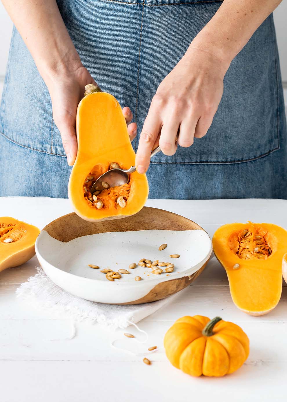 Für 4 Portionen etwa 500 g Kürbiswürfel mit 1 Esslöffel Olivenöl, ½ Teelöffel gemahlener Muskatnuss, Salz und Pfeffer würzen. Im Ofen bei 180 °C ca. 20 Minuten rösten, anschließend pürieren und mit etwas Sahne verfeinern. Perfekt als Beilage oder als wärmende Suppe.