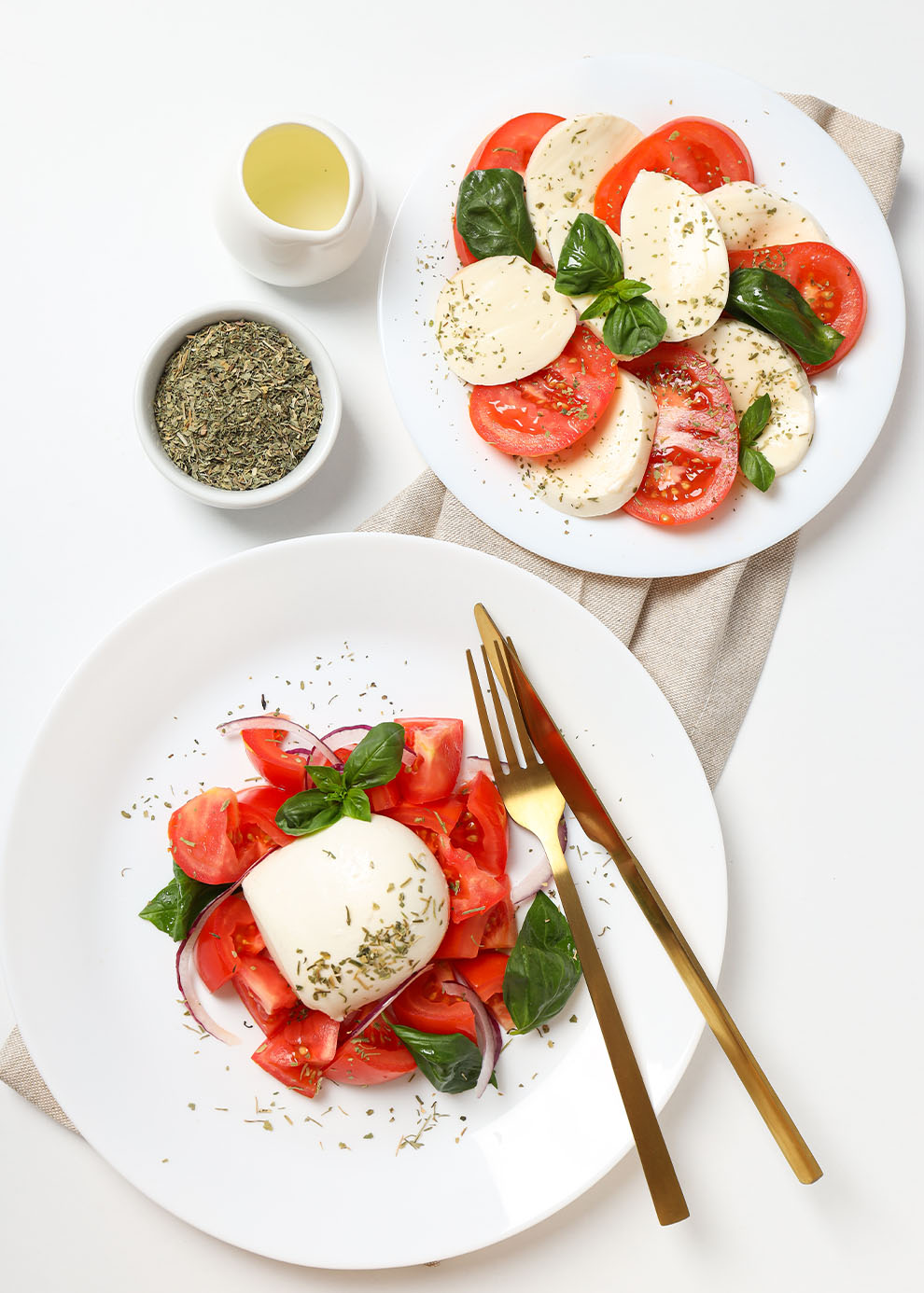 Für einen klassischen Caprese-Salat schneide 2 große, reife Tomaten und 150 g Mozzarella in Scheiben. Die Tomaten- und Mozzarellascheiben abwechselnd auf einem Teller anrichten. Mit 1 TL gerebeltem Basilikum bestreuen, 1 EL Olivenöl und 1 TL Balsamico überträufeln, leicht salzen und pfeffern. Schon hast du einen frischen, aromatischen Salat, der in wenigen Minuten zubereitet ist.