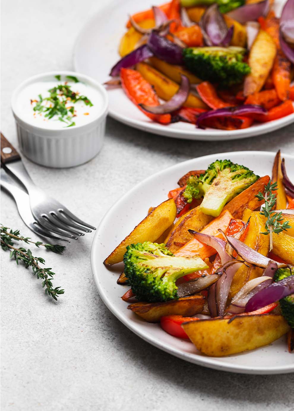 Für 2 Portionen Gemüse 1 kleine Zucchini, 1 Paprika und 1 Karotte in mundgerechte Stücke schneiden. Mit 2 EL Olivenöl, 1 TL gerebeltem Thymian, Salz und Pfeffer vermengen. Das Gemüse auf einem Backblech verteilen und bei 200 °C Ober-/Unterhitze ca. 20–25 Minuten backen, bis es leicht gebräunt und aromatisch ist. Perfekt als Beilage zu Fleisch oder einfach mit frischem Brot genießen.